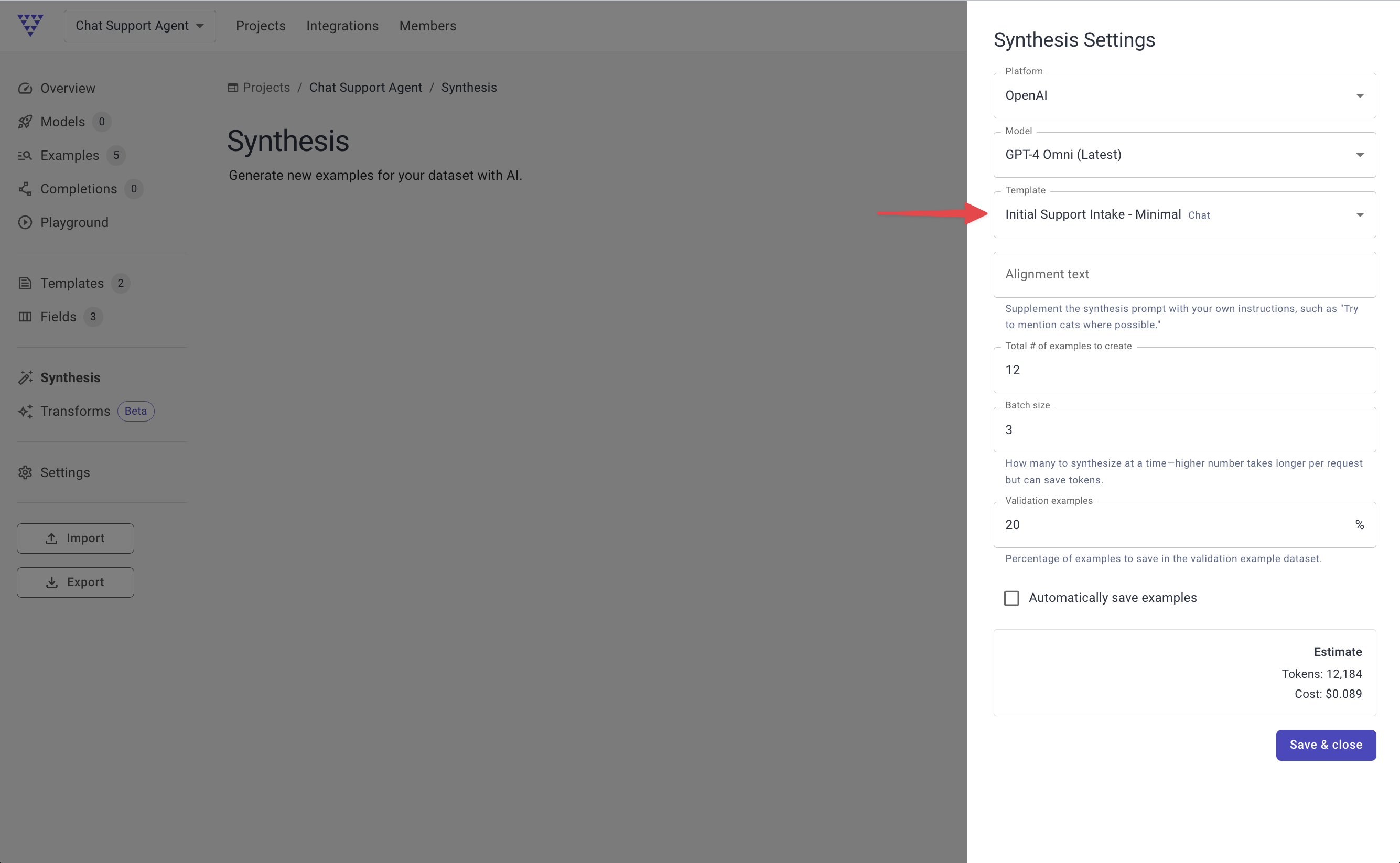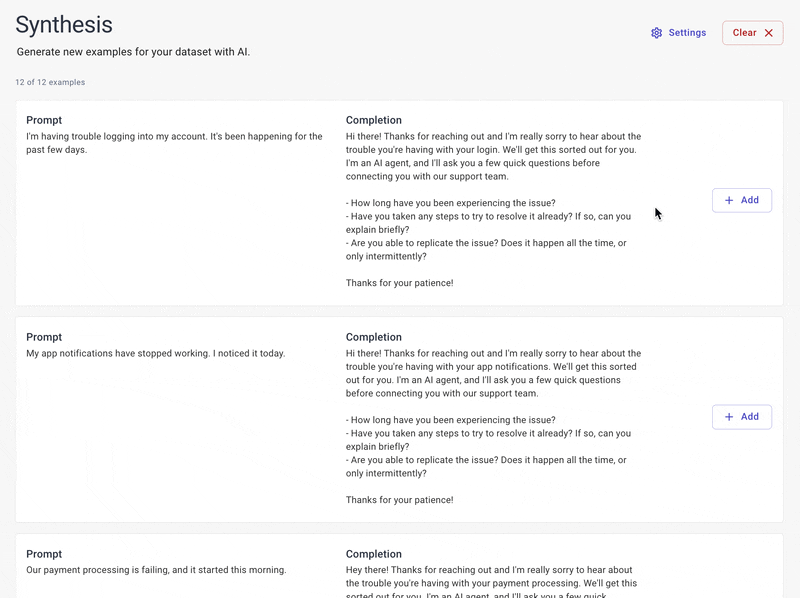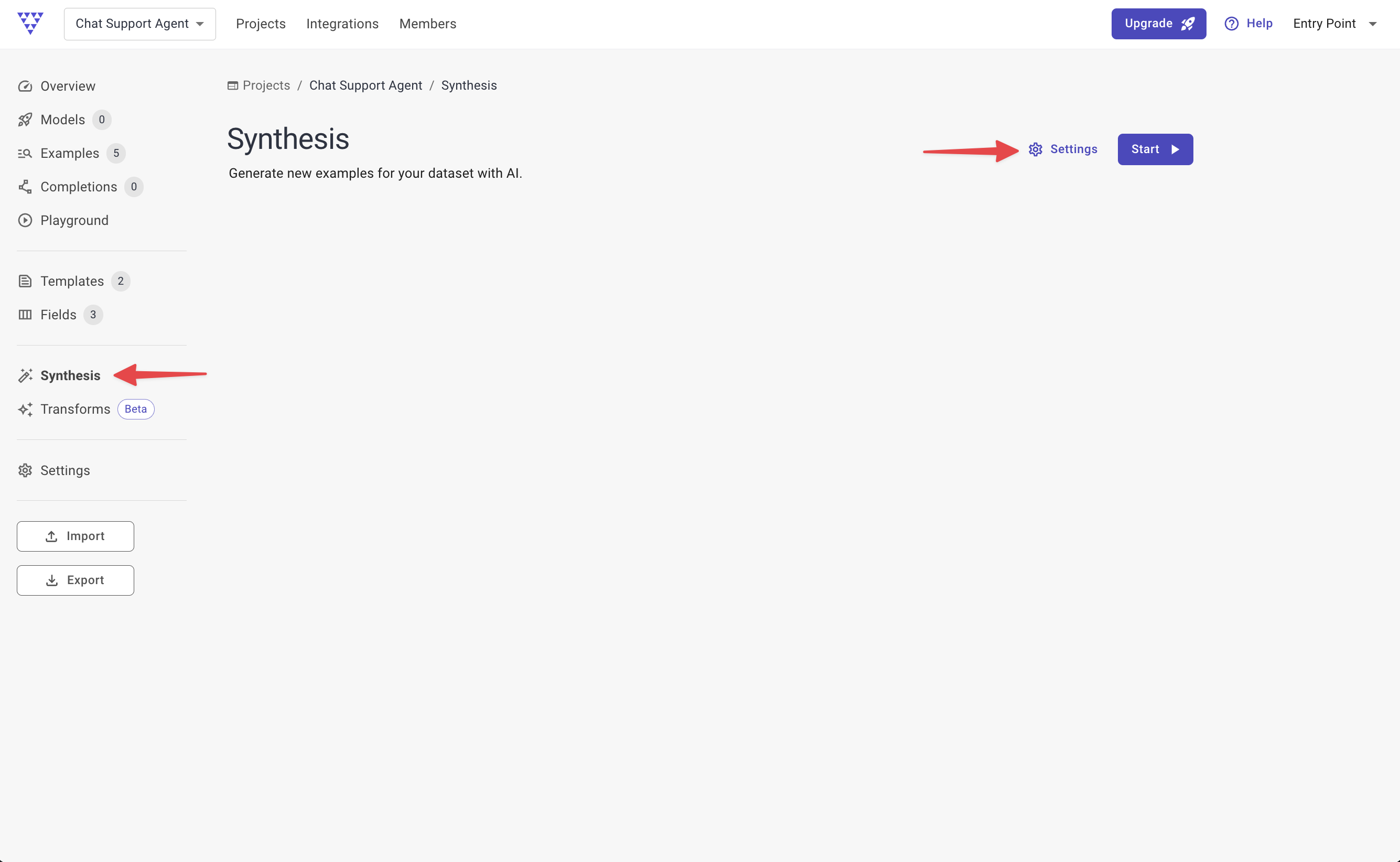 In this section, we'll use Entry Point's Synthesis feature to create new [examples](https://docs.entrypointai.com/key-concepts/examples) for our training dataset. This can be useful when you only have a limited amount of data and want to use AI to generate more.