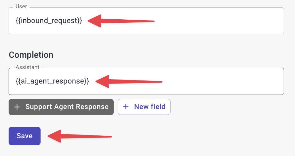 Set the `user` message to the "Inbound Request" Field and the `assistant` message to the "AI Agent Response" Field. Then, press "Save".&#x20;