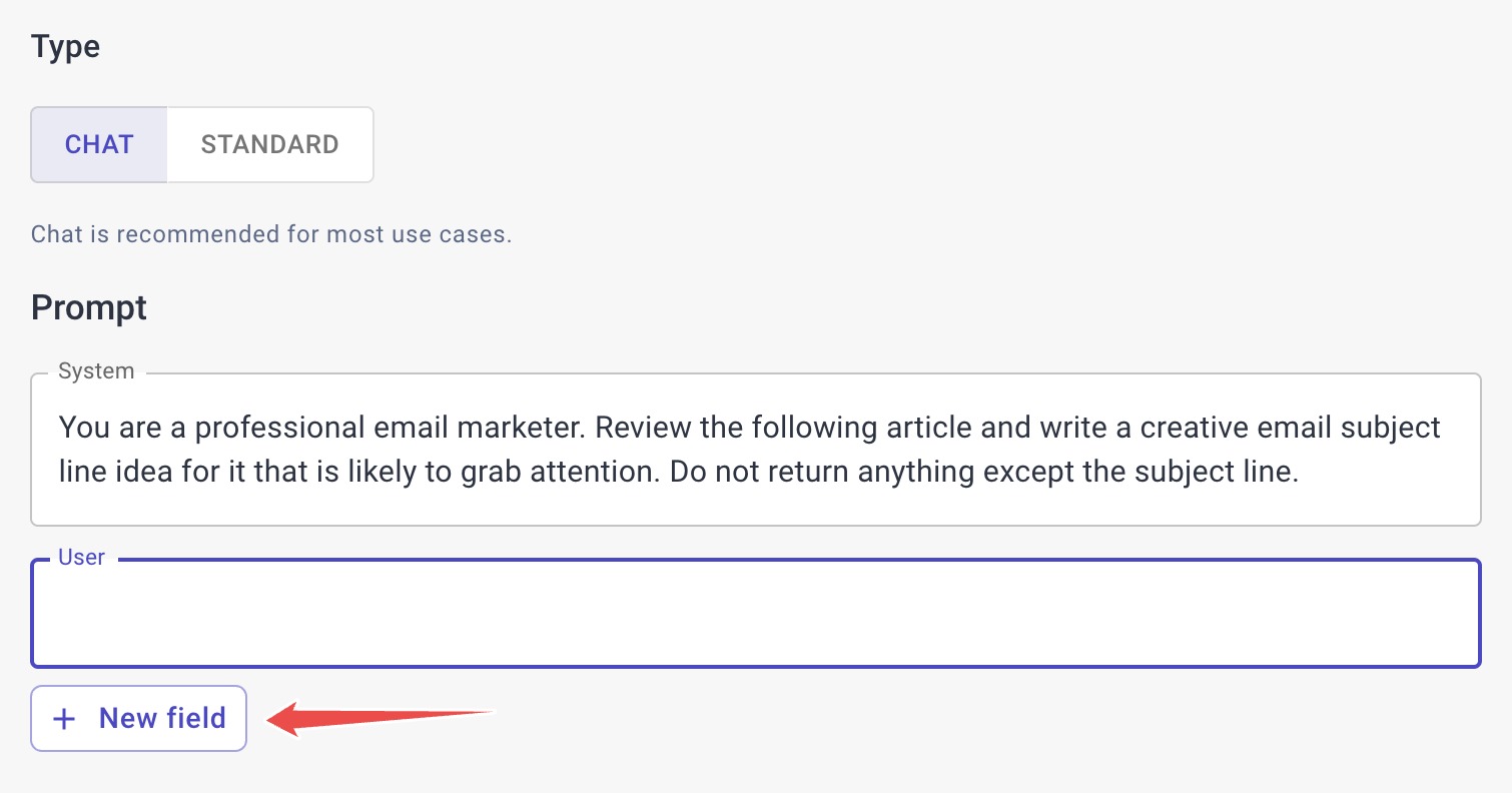 With the `user` prompt text box selected, press the "New field" button.